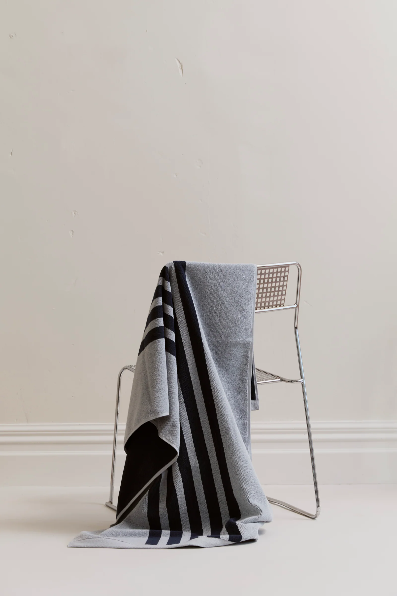 100% Organic Cotton bath towel constructed with a luxuriously soft handle. Through an exploration of the traditional stripe, Dawn's bold design challenges towelling convention. The monochromatic pairing of Ink & Sky in five vertical lines, creates a subtle disruption in any bathing space. Features a reversible colour-way.