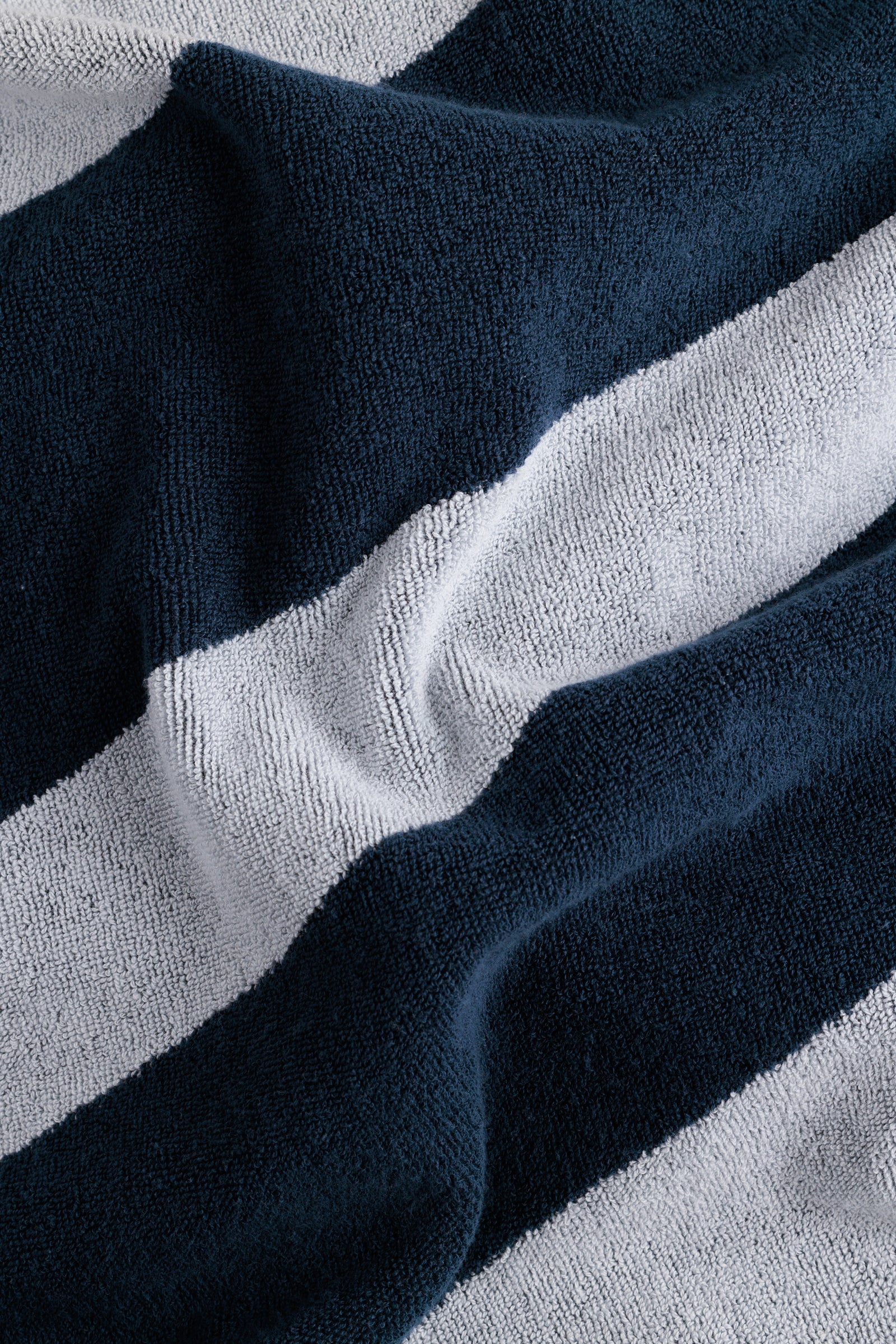 100% Organic Cotton pool towel. Luxuriously soft, Erin features a bold design, exploring BAINA’s interpretation of the traditional stripe. The monochromatic pairing of Ink & Sky in two diagonal lines conveys the feeling of movement. Features a reversible colour-way.