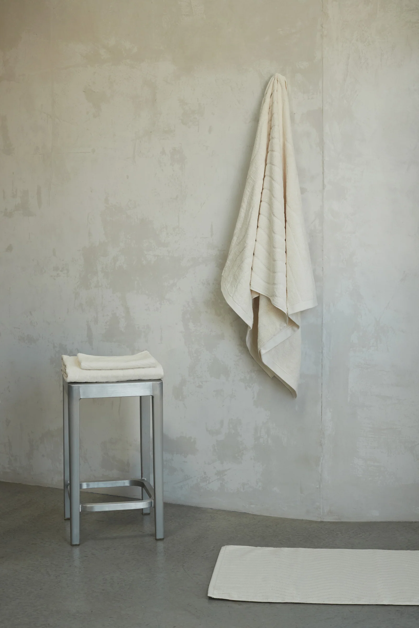 100% Organic Cotton bath sheet with a luxuriously soft handle. Features a repetitive and calming wiggle design inspired by the reverberations of skimmed water. Designed with the minimalist in mind.