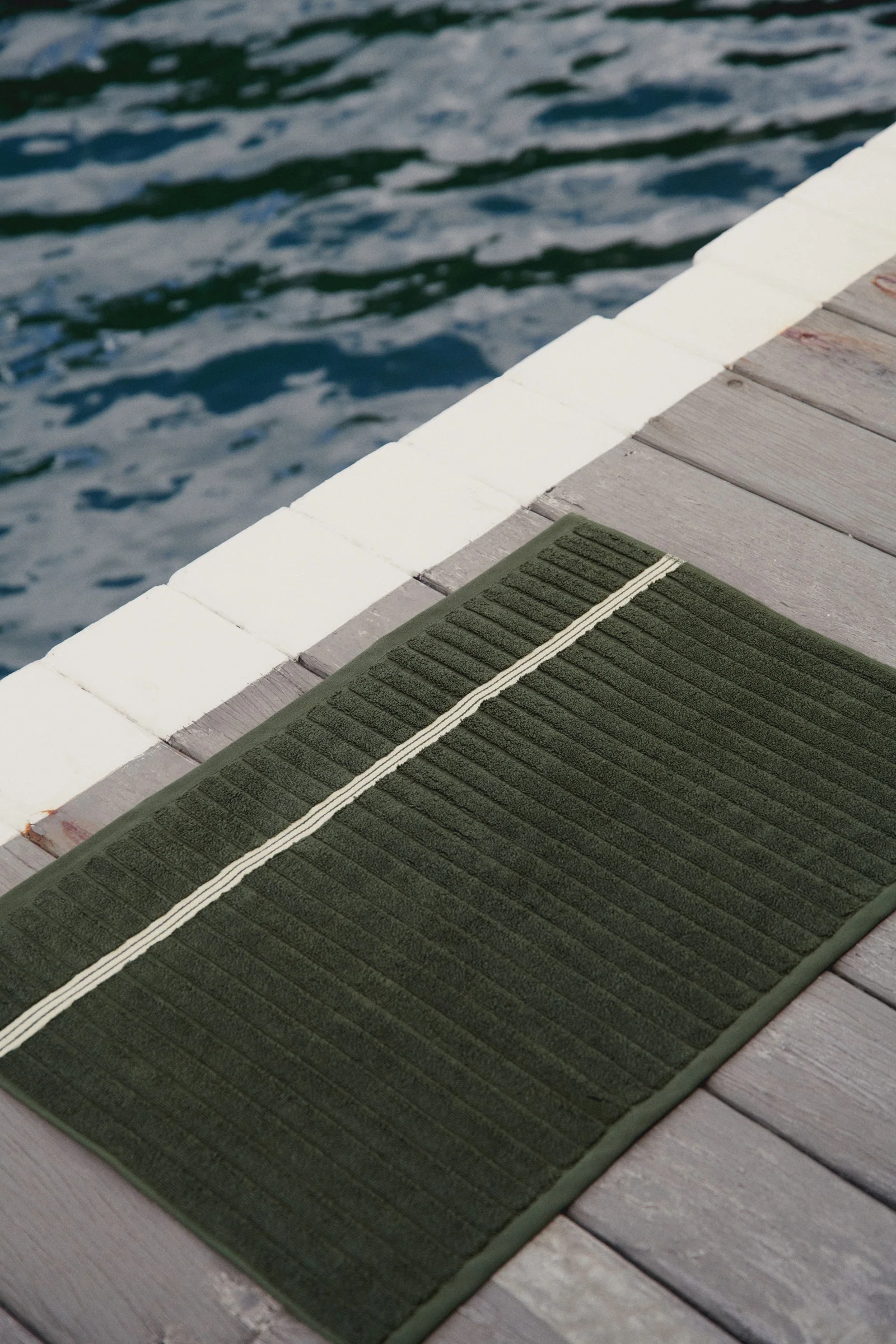 100% Organic Cotton bath mat. Taking inspiration from heritage club rooms, the Olympic is luxurious underfoot and defined by the collection's feature, a textural moss rib, accented by three crème stripes. Inspired by the spaces where an individual sits, inwardly connected to the post-match exhale.