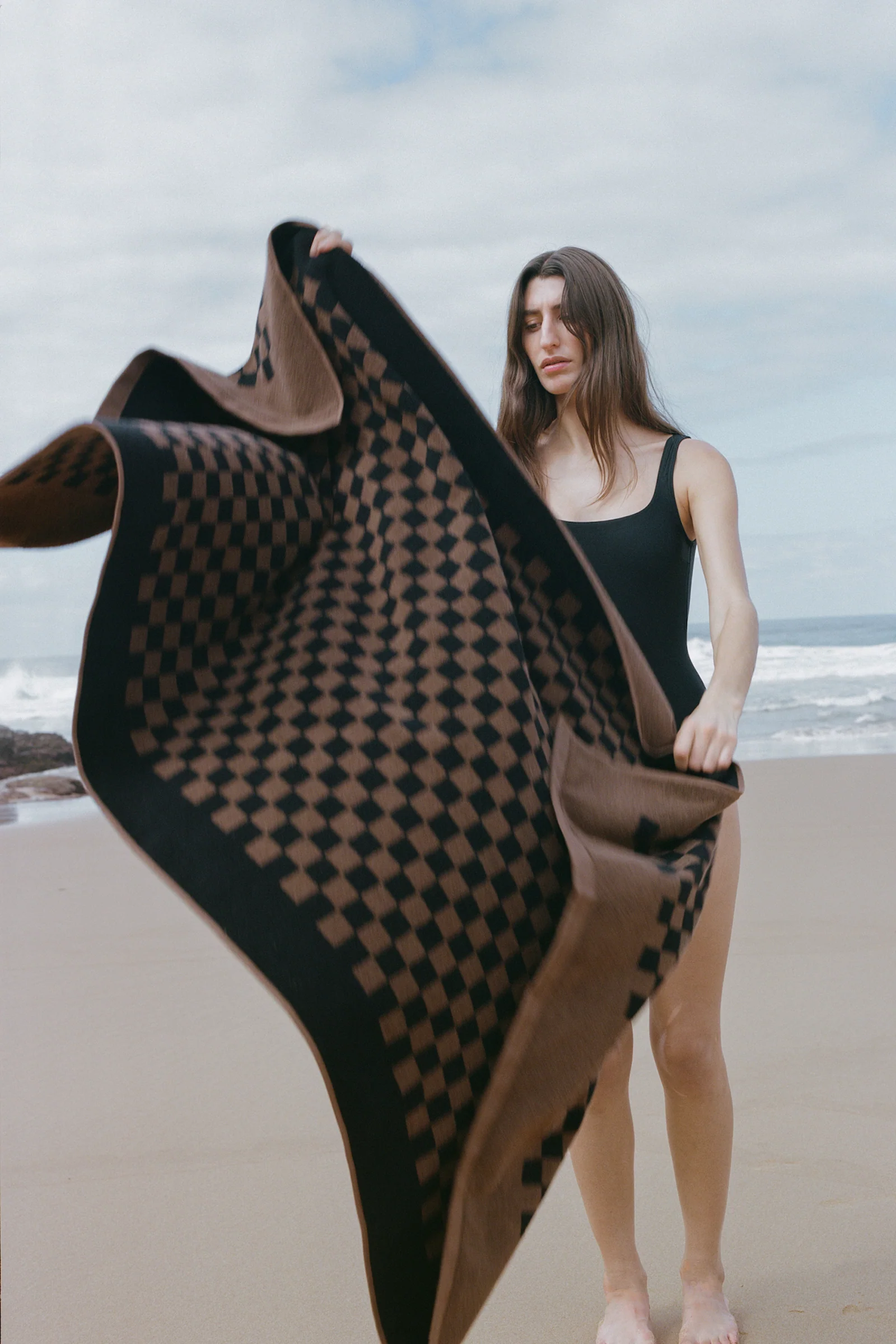 100% Organic Cotton pool towel or beach towel. This playful towel in checkerboard print is synonymous with the BAINA brand features a reversible colour-way. Contrasting against Noir, the rich Tabac checkerboard evokes a feeling of nostalgia within any bathroom or on any excursion.