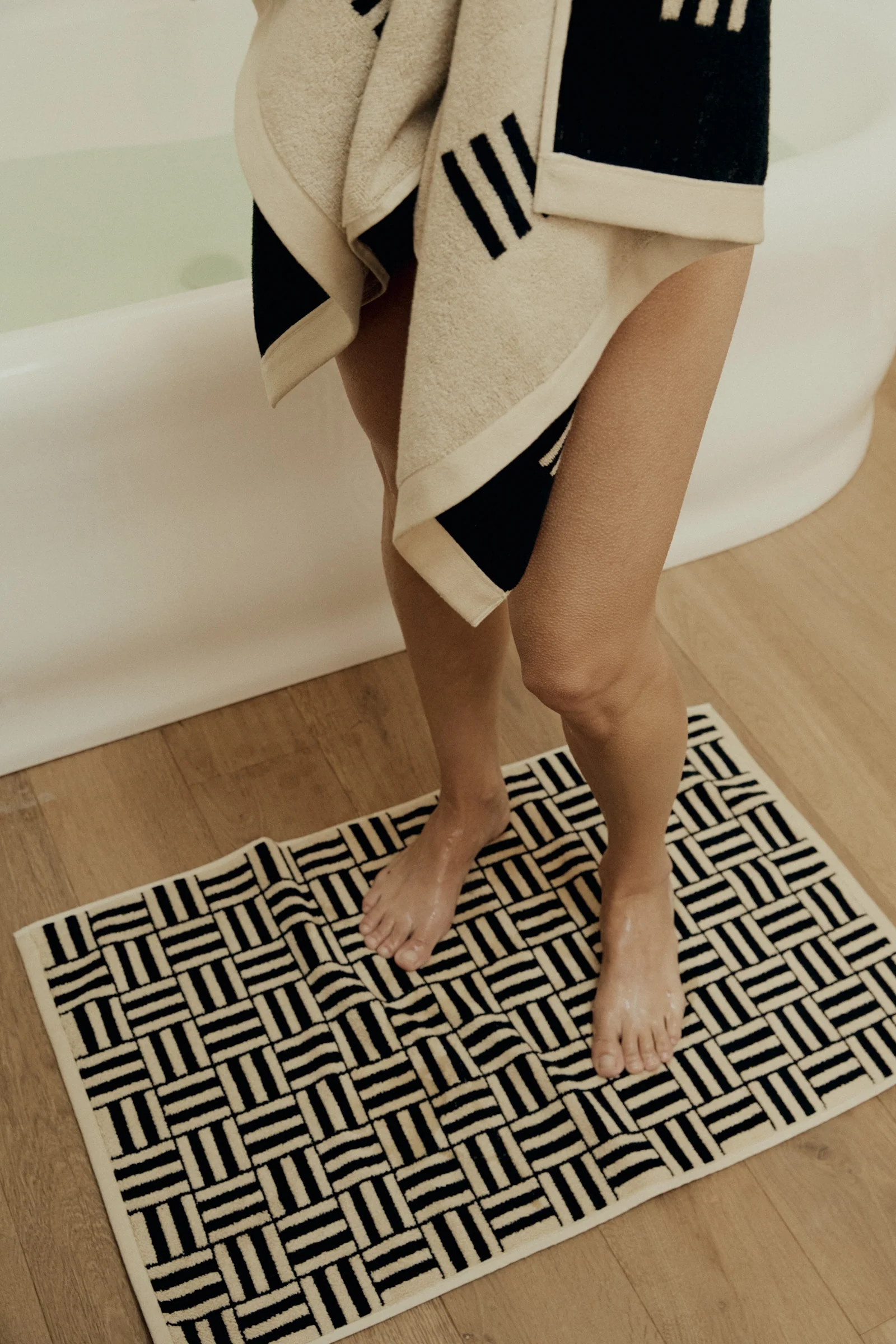 100% organic cotton bath mat for a luxuriously soft underfoot feel. The Saroma Bath Mat features a geometric weave print inspired by the rhythmic repetition seen in Art Deco tilling.